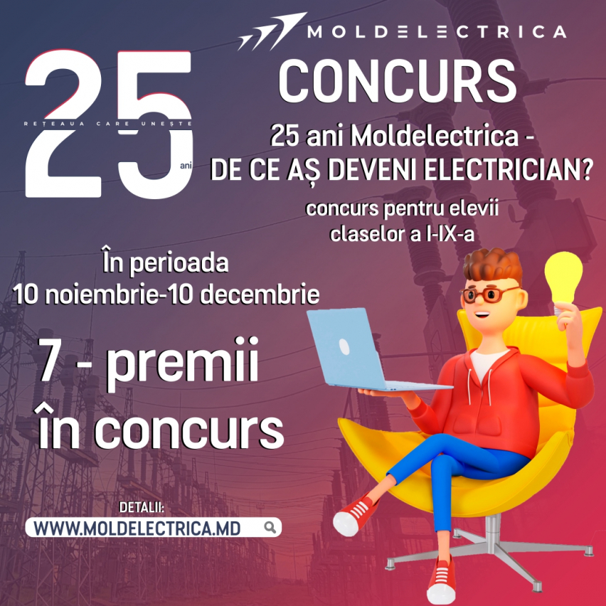 Întreprinderea de Stat „Moldelectrica” anunță lansarea concursului creativ „25 de ani Moldelectrica – de ce aș deveni electrician?”, organizat cu prilejul Zilei profesionale a Energeticianului și al celebrării a 25 de ani de la fondarea întreprinderii.