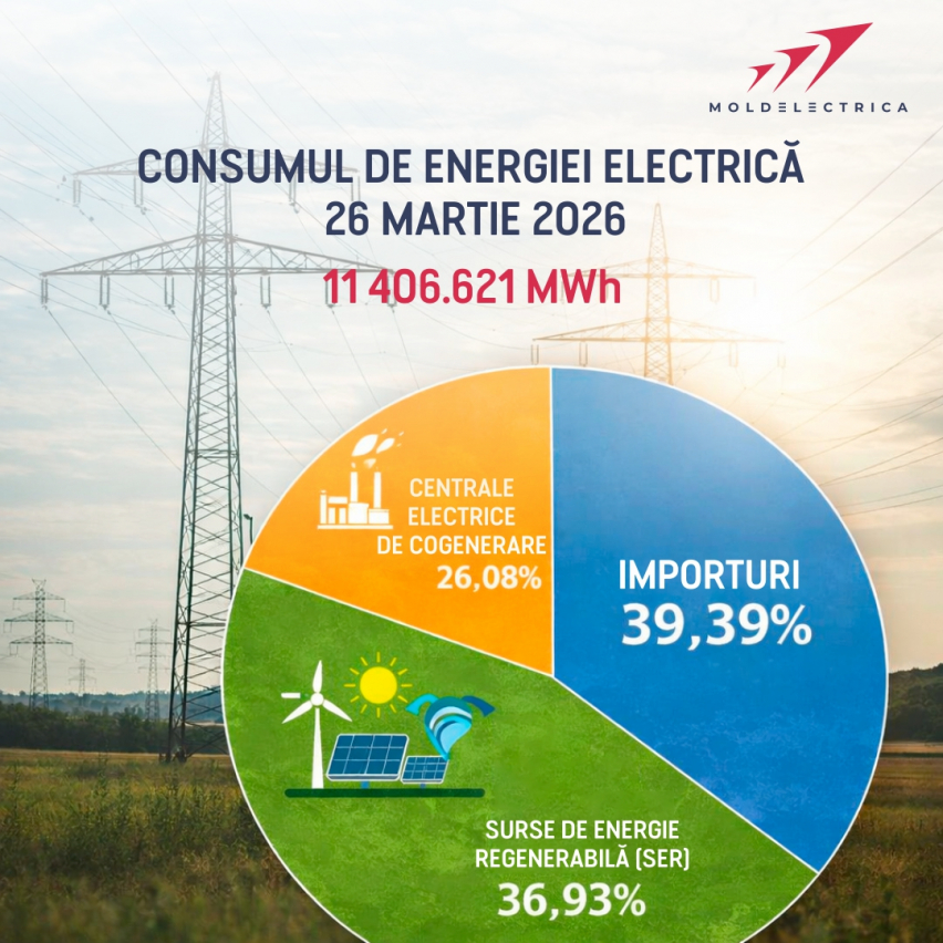 Î.S. „Moldelectrica” informează că, în baza datelor operative colectate prin sistemul SCADA, consumul de energie electrică înregistrat în ziua de ieri la nivelul Sistemului Electroenergetic Național (SEN) a constituit 11 406.621 MWh, ceea ce reprezintă o diminuare de 3% față de ziua precedentă.